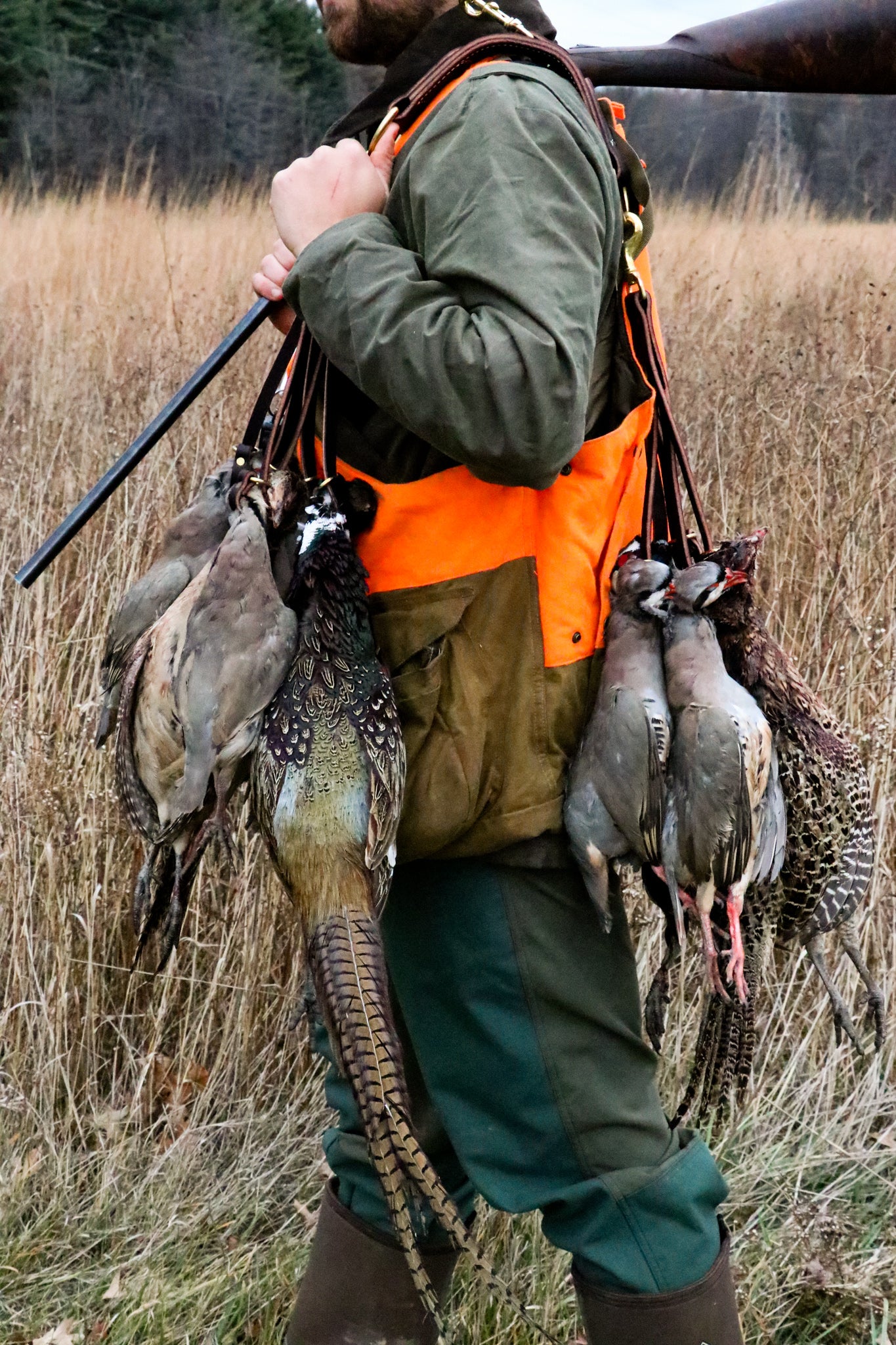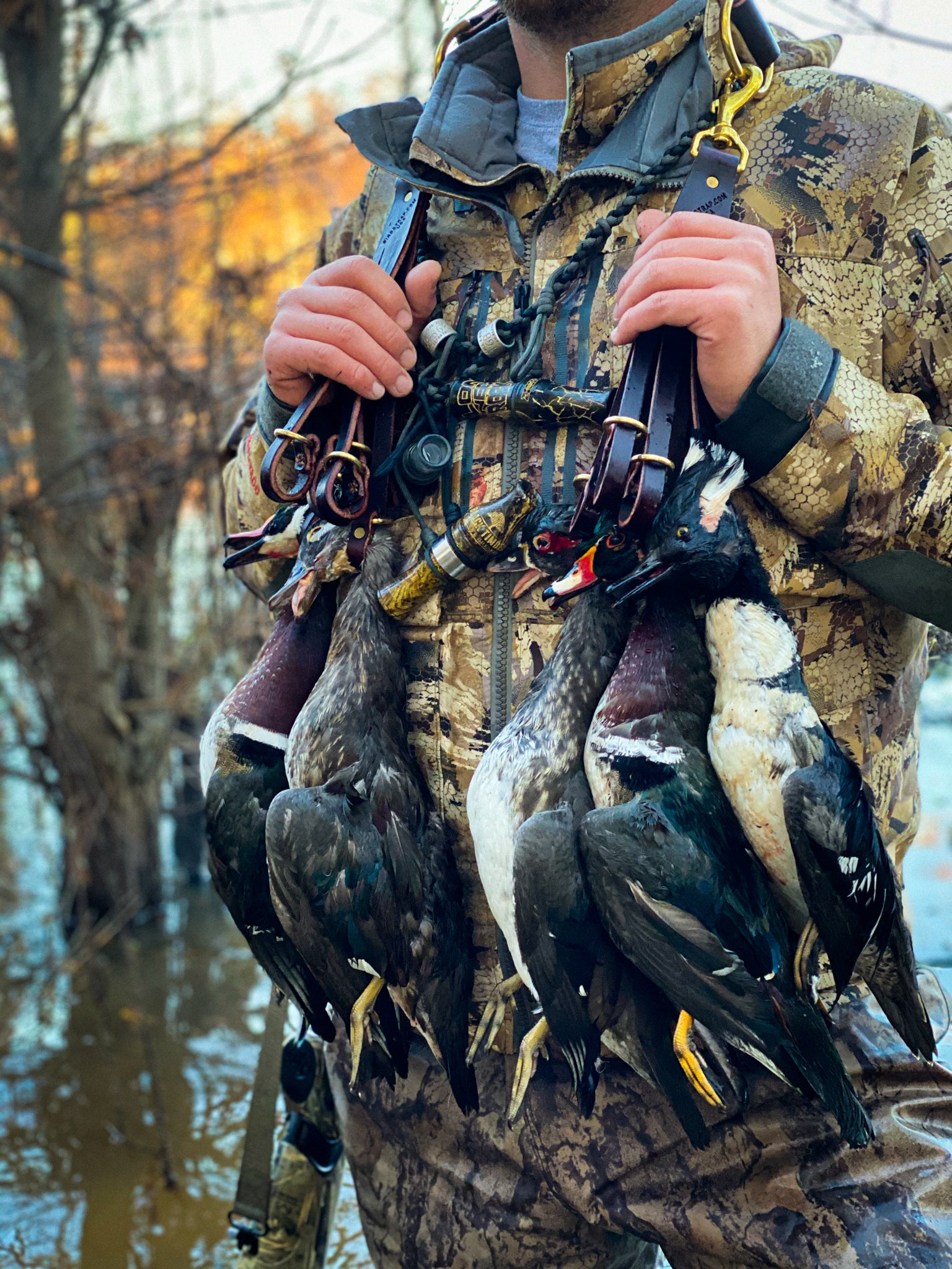 This is the most versatile strap we offer. Constructed of heavy latigo leather and solid brass hardware to provide many years of use. The 6-loop drops can be removed and attached to your waders, pit/ground blind wall or to a tree while hunting the timber. Six loops attach with a heavy duty solid brass clasp to each end of the strap. The strap has been doubled and sewn with a 2" brass d-ring to increase comfort and durability. The edges have also been rounded for comfort. Crafted in Texas with US tanned leather.