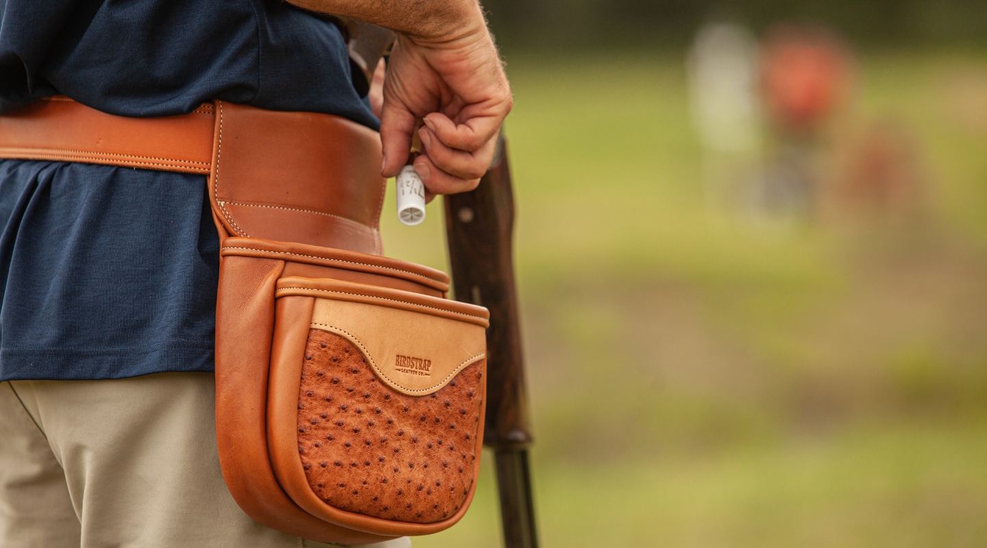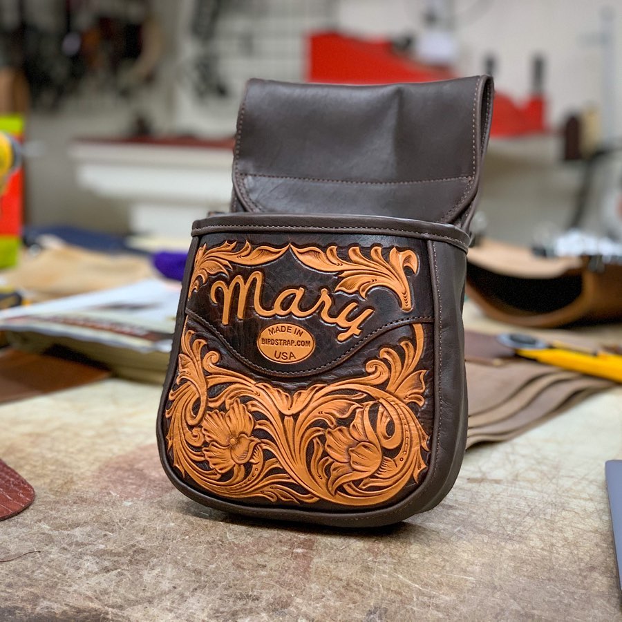 The same popular designs of our traditional shell bags. Constructed using a medium tempered leather from the Horween Tannery in Chicago, IL. The front panel has been given a Birdstrap twist on the Texas flag. The belt loop is extra wide to accommodate the widest of belts. Bag can hold 50 rounds of 12 gauge shells. Made in Texas, USA.